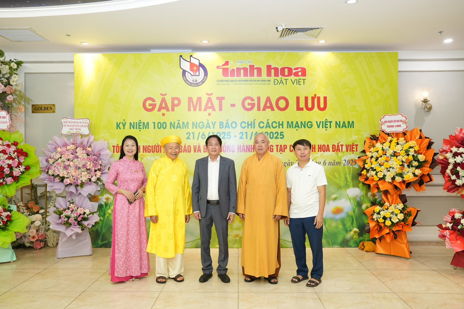 Nghệ nhân, đồng thầy Hoàng Ngọc Viện chụp ảnh lưu niệm cùng các đại biểu tại chương trình gặp mặt – giao lưu nhân Kỷ niệm 100 năm Ngày Báo chí Cách mạng Việt Nam (21/6/1925 – 21/6/2025) do Tạp chí Tinh hoa Đất Việt tổ chức.