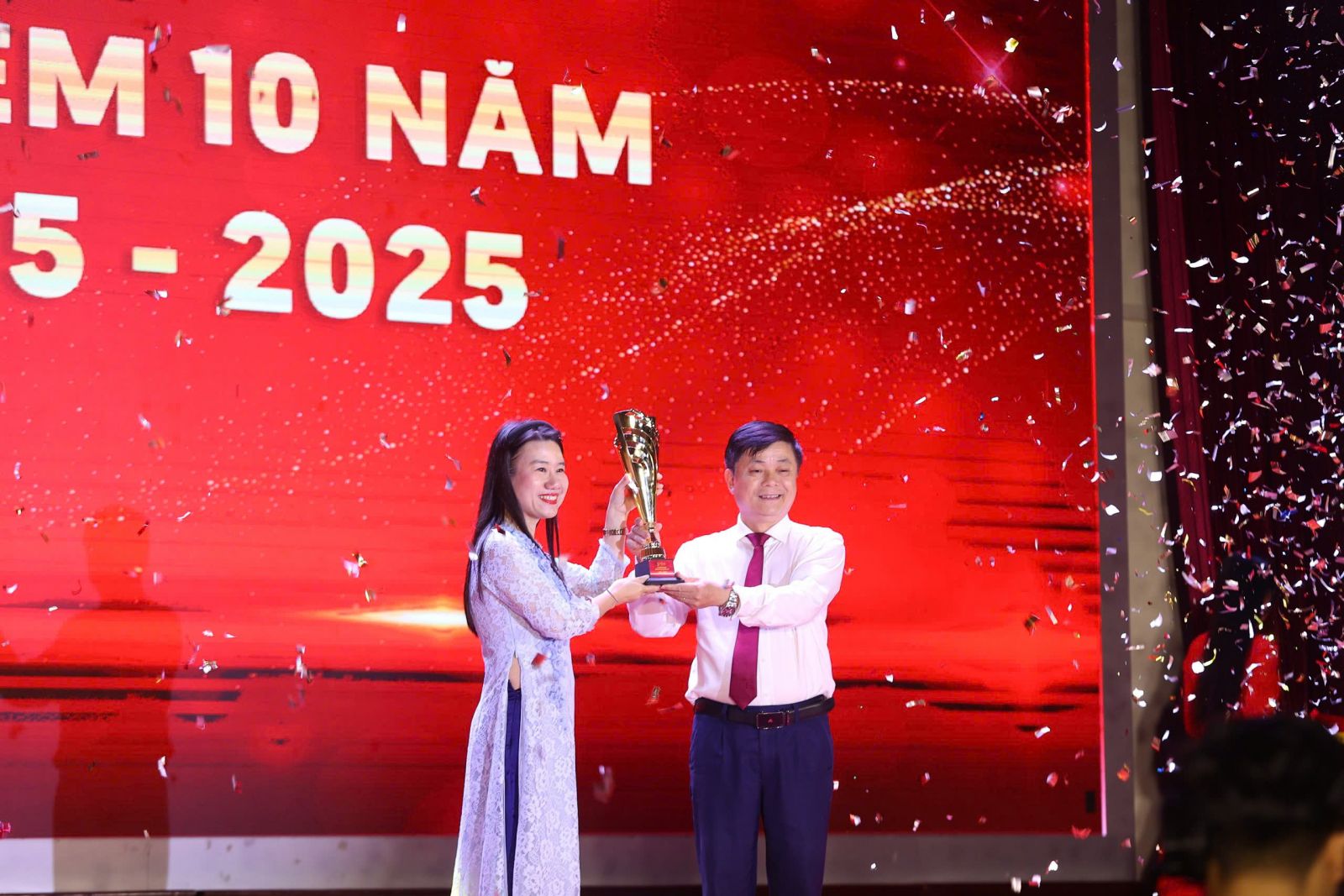 PGS,TS. Phạm Minh Sơn dâng cúp chúc mừng kỷ niệm 10 năm Giải Báo chí Sóng trẻ.