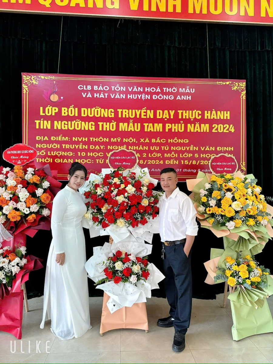 Nghệ nhân ưu tú Nguyễn Văn Định – Chủ nhiệm Câu lạc bộ Bảo tồn Văn hóa thờ Mẫu và hát văn huyện Đông Anh đón nhận những lãng hoa tươi thắm từ các học viên trong một khóa học năm 2024.