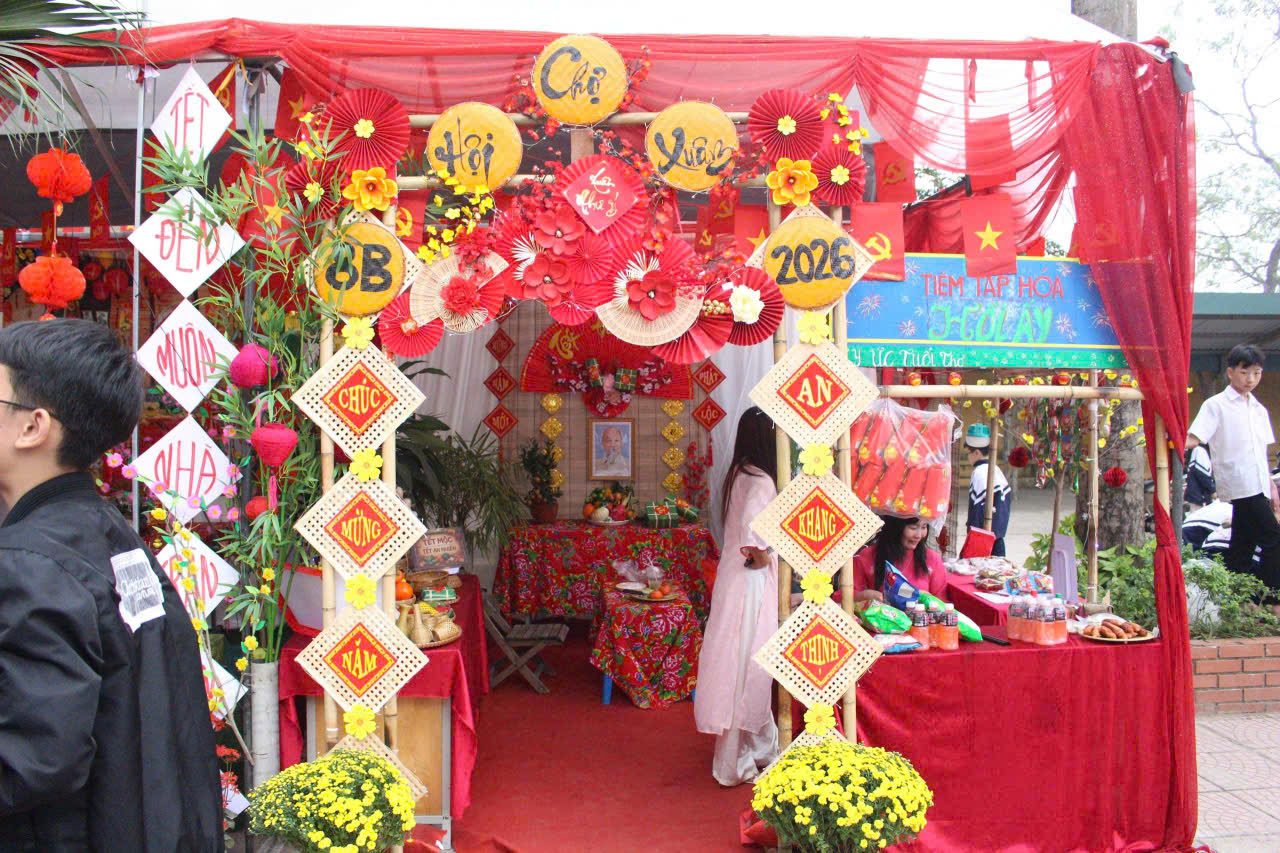Ngày 30, 31/01/2026, sân trường THCS Đại Yên thực sự trở thành một ngày hội tuổi thơ của các em học sinh. Khuôn viên trường trở nên nổi bật với gam màu rực rỡ của cờ, hoa, đèn lồng và các gian hàng tham gia Hội chợ xuân của các lớp.