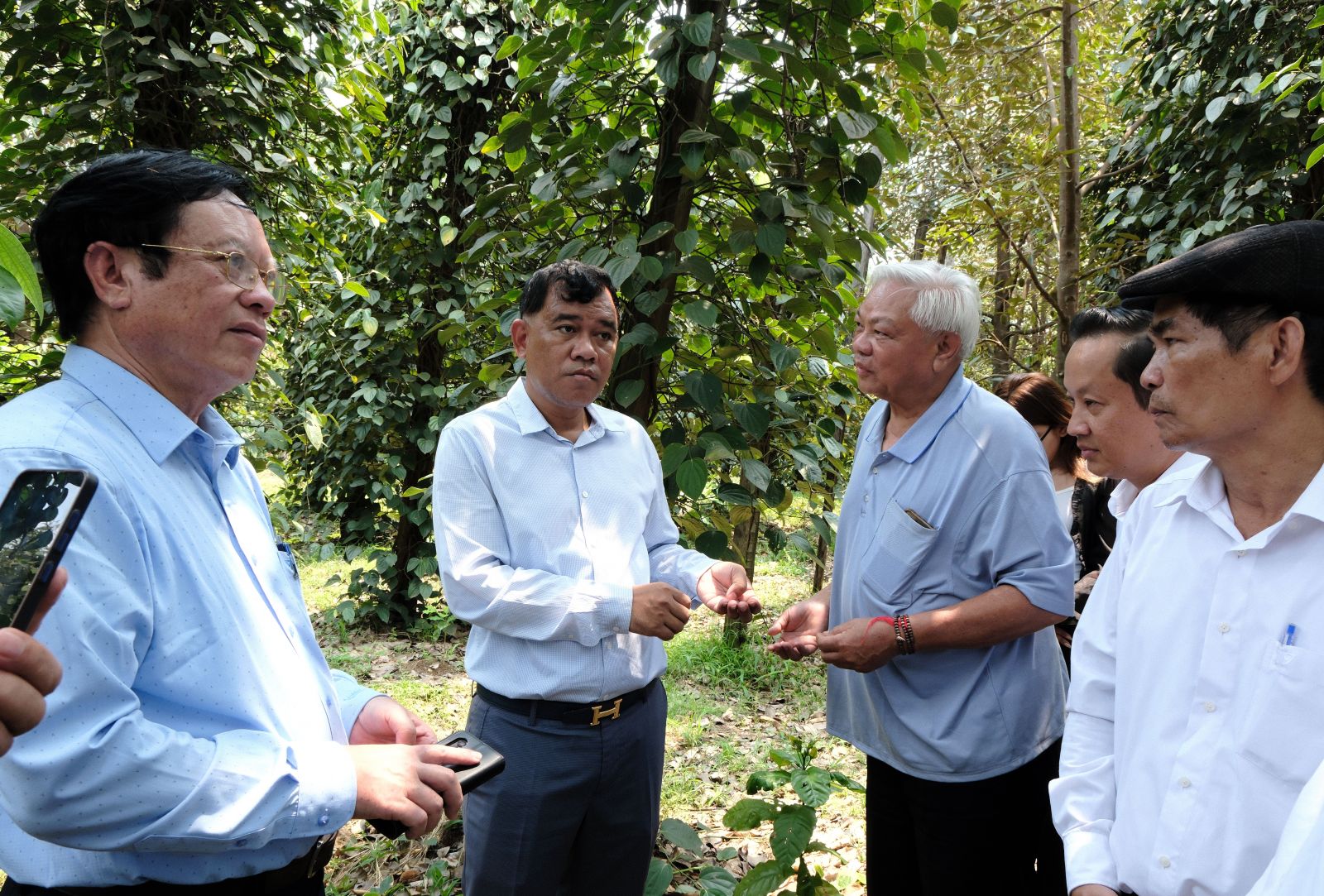 Trao đổi kinh nghiệm trồng tiêu xen cây sầu riêng với Phó Tỉnh trưởng Van So Phia (cũng là một doanh nhân)