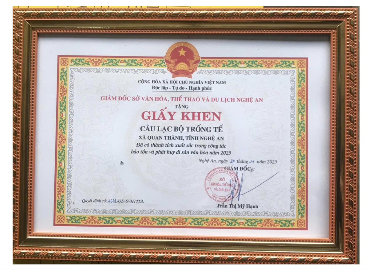 Về xã Quan Thành (Yên Thành, Nghệ An), niềm vui như nhân đôi khi “Nghệ thuật trình diễn trống tế của Yên Thành” chính thức được Bộ Văn hóa, Thể thao và Du lịch ghi danh là Di sản văn hóa phi vật thể quốc gia vào tháng 6/2025. Trong dòng chảy di sản ấy, cái tên Lê Khắc Dinh hiện lên như một biểu tượng của sự tận hiến.