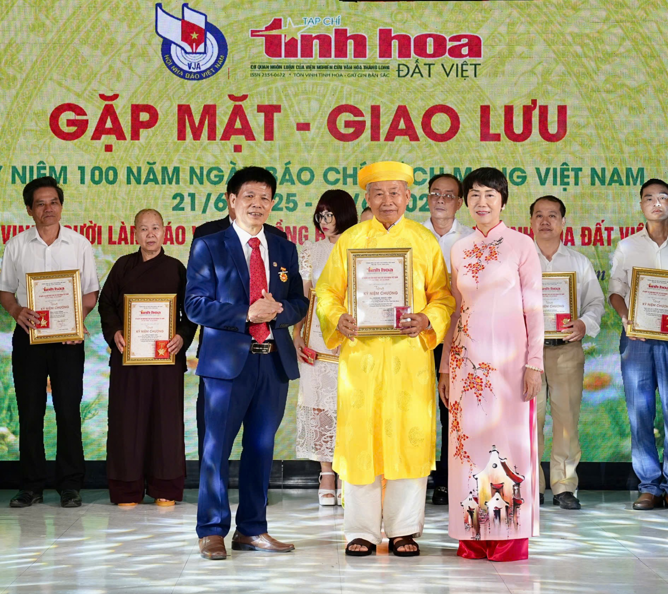 Nghệ nhân, đồng thầy Hoàng Ngọc Viện chụp ảnh lưu niệm cùng các đại biểu tại chương trình gặp mặt – giao lưu nhân Kỷ niệm 100 năm Ngày Báo chí Cách mạng Việt Nam (21/6/1925 – 21/6/2025) do Tạp chí Tinh hoa Đất Việt tổ chức.