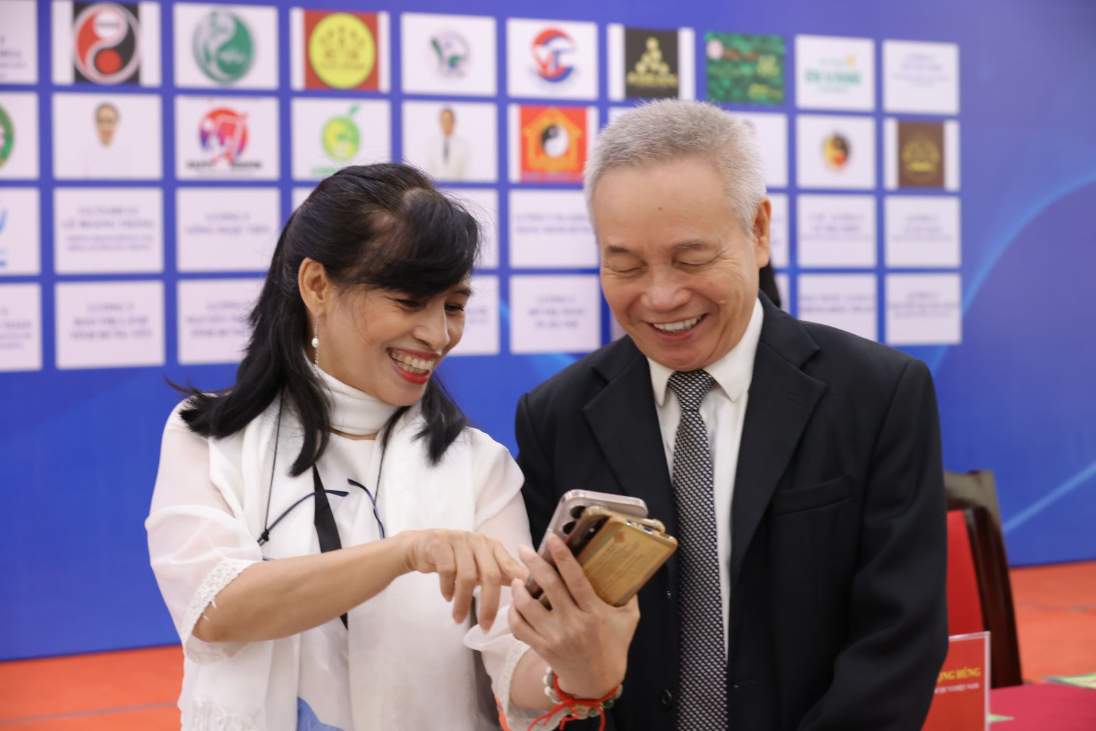 Lương y Nguyễn Thị Tâm - Chủ trị phòng khám đông y gia truyền Tâm Nguyễn giới thiệu dùng điện thoại để cứu bệnh nhân từ xa với PGS.TS Đại tá Hồ Bá Do - Phó Chủ tịch Hội Y học cổ truyền Việt Nam.